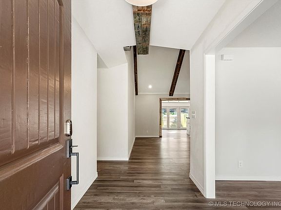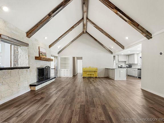 right by Southern Hills, Eisenhower International School, and with quick access to HWY 44, putting Brookside, Utica Square, Cherry Street, and Downtown Tulsa all within a 15-minute drive. Show-stopping living room with 15 foot soaring vaulted and faux-beamed ceilings, a floor-to-ceiling stone fireplace and built-in bookcase. Just off the formal dining room, the kitchen featuring granite countertops, stainless steel appliances, gas range and oven, and an oversized island with bar seating. Two-car garage entry with cozy laundry nook and coffee bar station. The primary suite with a spacious bedroom, elegant ceiling trim, and French doors leading to a sunlit private office with tongue-and-groove beamed ceilings and inspiring views. Brand new instant water heater! Fridge, Washer/Dryer included. Owners/agents.