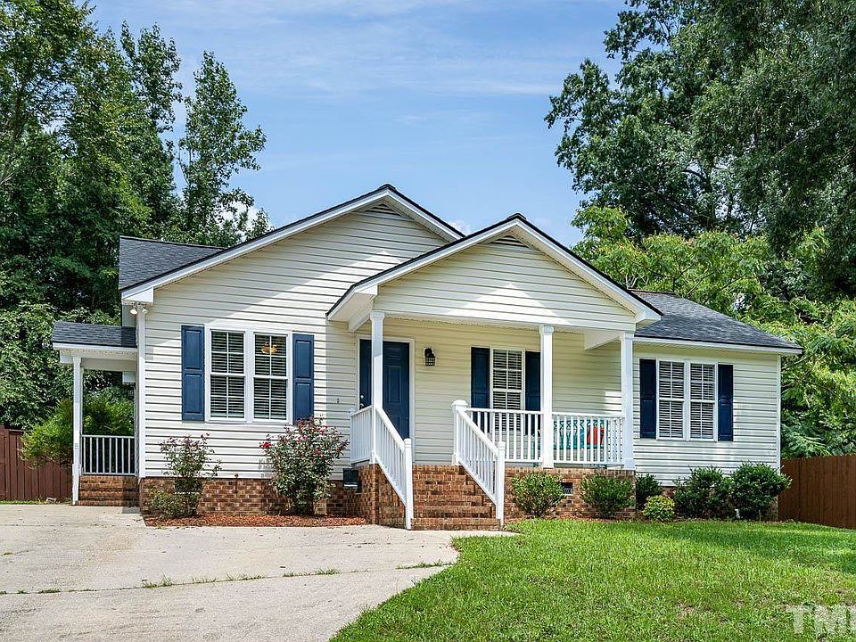 Showings begin on Wed. on this updated & modern one-level home with fenced backyard is ready for you! Just move in & enjoy this 3 BR/2 full bath beauty. It sits high on its lot & features a sweet front porch for great curb appeal! Renovated in 2020, the kitchen boasts white cabinets, granite countertops, an undermount sink, stainless appliances - plus renovated bathrooms, new lighting, laminate flooring in main areas & carpet in the 3 bedrooms & neutral paint throughout! Deck overlooks flat backyard that will be perfect for your gardening touches, games or adding a play structure. There are no HOA fees - making it a great owner-occupied or investment property! Convenient location & easy highway access for shopping, etc. and just 12 miles to downtown Raleigh! Don't miss this one!