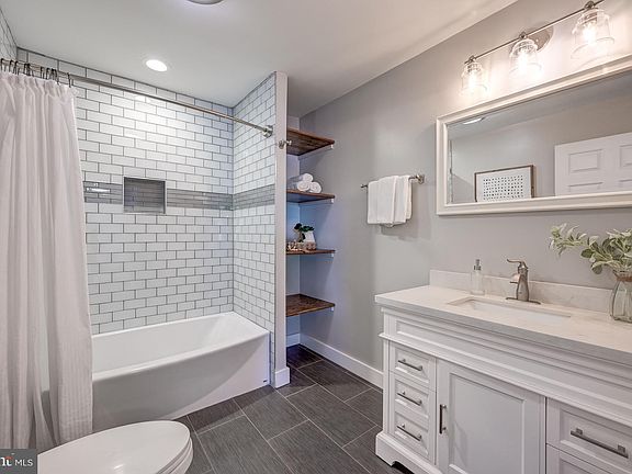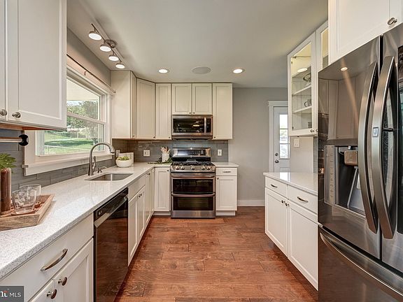 Your oasis awaits in this absolutely gorgeous five bedroom, three bathroom home completely renovated with modern upgrades throughout. Enter inside into the open concept main level highlighting hardwood floors, sun-drenched windows, recessed lighting and a calming neutral color palette. Kick your feet up and watch your favorite movies in the family room with built-in wall surround sound speakers, projector, retractable screen. The gourmet kitchen is fully equipped with stainless steel appliances with gas cooking, quartz countertops, glass backsplash, 42” soft-close cabinets and pantry. Cozy living room with light-filled bay window and wood-burning fireplace. The main level features a convenient bedroom and full bathroom. Upstairs, the massive primary bedroom suite offers a huge walk-in closet, private sunroom, doors to the upper level balcony and an attached full bathroom with a dual-sink vanity and glass tile shower. Another two bedrooms complete the upper level sleeping quarters. The fully-finished lower level includes the fifth bedroom, a third full bathroom, storage room or den, and expansive recreation room with a wet bar and dining area that make entertaining a breeze. You will love spending time outside on the deck that overlooks the rear yard with space for everyone’s activities. Leased Sunnova solar panels, two storage sheds, ample parking, energy-efficient gas furnace and a/c system replaced in March 2022.
