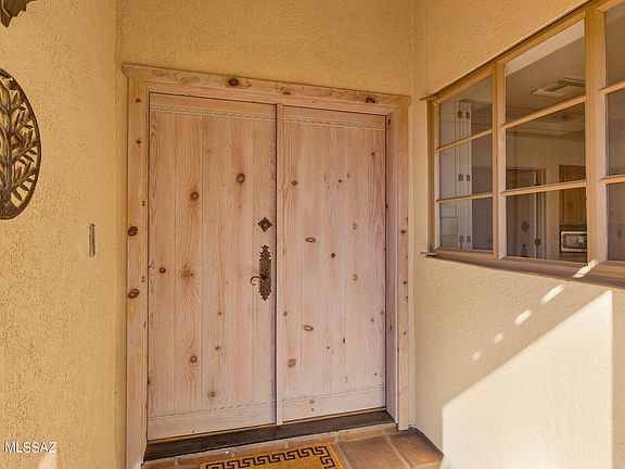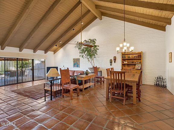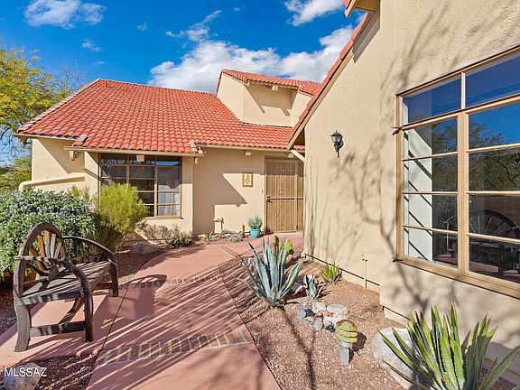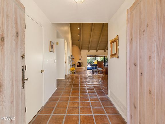 This home embraces you with warmth when you come through the front door. High cathedral wood ceilings & the richness of the saltillo tile floors; beautifully proportioned large rooms. The living room overlooks the very private patio that backs to desert with Catalina mountain views. Beautiful mountain views also from the large primary bedroom. The neighborhood pool and spa are close by.This home has been a winter rental at $3500 a month. This is the perfect location w/ easy access to many restaurants in the area and close by La Encantada.Sellers have never used the alarm system and do not know if it works or not. Pull down ladder in master closet leads to large area that is great for storage.