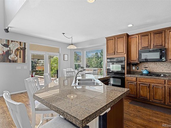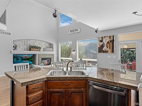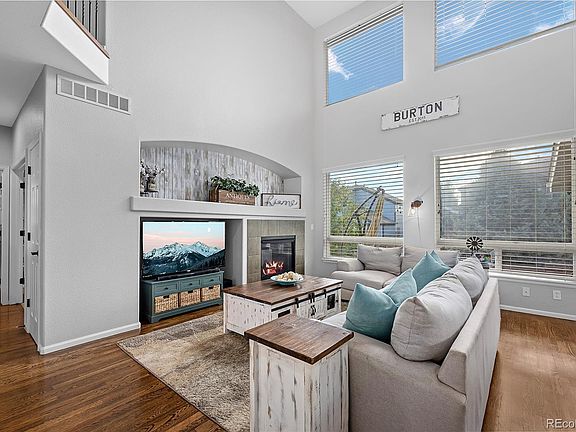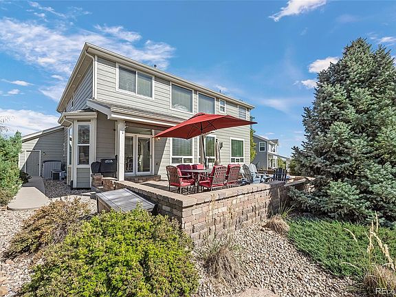 The double French doors from the kitchen lead you to the sunny and partially covered brick patio, where you can unwind and enjoy the beautiful Colorado evenings. A gas fire pit adds a touch of warmth and ambiance. The side yard provides ample space for outdoor activities, and there are miles of trails just beyond the backyard fence. A short walk will take you to the community pool, clubhouse, parks, and trails, providing endless recreational opportunities.