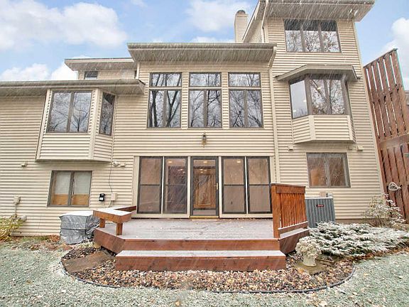 Beautiful home with soaring ceilings and privacy behind the home with trees and a pond. Association amenities include a clubhouse, party area, weight room, sauna, outdoor pool, tennis/pickleball courts. Custom designed Kitchen: Brazillian Teak flooring, granite countertops, two ovens, pull-out cabinetry, new bosch dishwasher, 3 door fridge. The sunroom features 2 skylights, 100 yr old barwood floor, and black ash walls. Office: built-in desks and hanging file drawers. TWO master baths!!! each is a private 3/4 bath with a shared soaking tub. Nice 3-season room on the lower level and a deck. Lots of storage space in the lower level which is mostly finished and is NOT included in the MLS square footage.