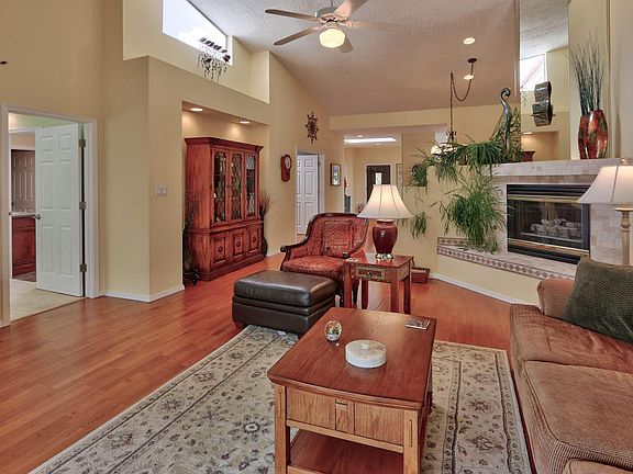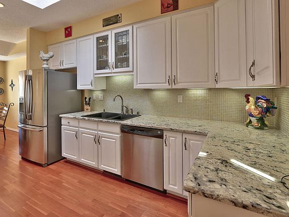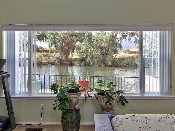Stunning home sitting on the lake with fountain and ducks. This 3 bedroom beauty is open, light and spacious with all new finishes. Gleaming wood floors, cozy carpet and lovely tile cover the floors. Granite, stainless kitchen. Light baths the entire home with huge windows looking over the lake. Front and back courtyards are tiled with the front having classy awnings.The floorplan flows beautifully with the guest room separated for privacy. This home has class! A must see in a community for adults 55+. Professional measurements will follow.