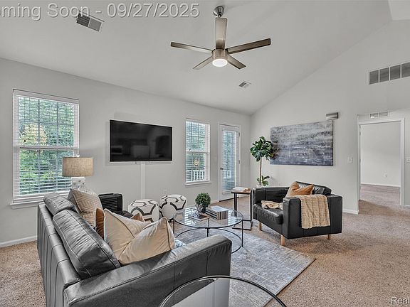 Tucked away in a quiet Howell community, this 2-bedroom, 2-bath condo is more than just a home — it’s a retreat. As a rare end back unit, it offers unmatched privacy with every window facing nature instead of neighbors. From the moment you step inside, vaulted ceilings and large windows create an open, airy atmosphere filled with natural light. Units with this setting and view almost never become available. With 1,317 sq. ft. of thoughtfully designed living space, the layout blends comfort and function. The kitchen and its included appliances open into a bright dining and living area. From here, step onto your private balcony, overlooking the back of the subdivision and a spacious green area reserved from the bustle of the community. Whether enjoying morning coffee, catching a sunset, or simply unwinding after a long day, this setting delivers the peace and quiet condo buyers are searching for. The primary suite is a true retreat, complete with soaring ceilings, two walk-in closets, and its own full bath. The second bedroom is well-sized and located across from another full bath with a tub/shower combo. Just outside, an oversized storage closet provides even more convenience, making it easy to keep things organized. Fresh, neutral paint throughout creates a clean canvas ready for your personal touch, while carpet in the bedrooms and living spaces adds warmth and comfort. Additional features include in-unit laundry, a private one-car garage, and an abundance of natural light that makes the home feel inviting all day long. The community is well-maintained and ideally located — only minutes from Downtown Howell’s shopping, dining, and festivals, with quick access to M-59 and major freeways for easy commuting. This isn’t just another condo — it’s one of the most desirable units in the subdivision. With its end-unit location, nature views, and move-in-ready condition, this home offers privacy, value, and a lifestyle that feels tucked away yet connected.