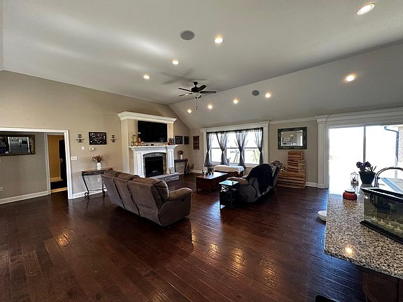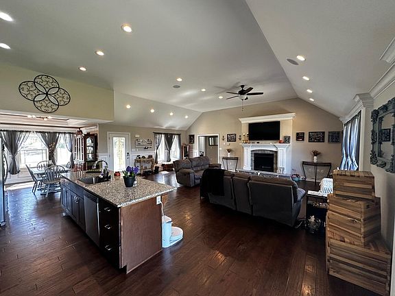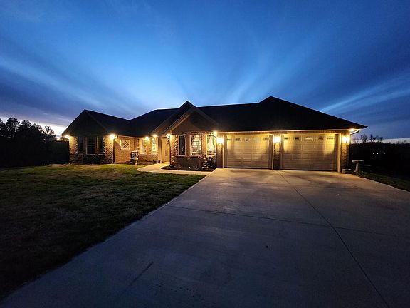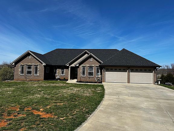 Super handsome and spacious (2212 sqft) brick home trimmed with stone in one of my favorite neighborhoods. Very well kept and maintained with many appealing features - Main level living offers primary bedroom that boasts huge walk in closet, spacious bath (soaker tub, nice double headed shower, private potty) and tray ceiling. Open floor plan kitchen bar area, stainless appliances, granite counter tops, hardwood floors, carpet in bedrooms, gas fireplace trimmed with crown molding. More unique ceilings throughout. Two bedrooms across the house with bathroom in between. Just inside coming from the garage you will have a laundry room and half bath in the hall area. Home also offers a fully automatic pet door to the back yard area that is operated with a remote for your animals collar that will stay with the home. Outside area offers nice fenced yard (installed 2023) and large 1.92 acres total to enjoy the outdoor living. All of this just minutes from town and enjoy the beautiful scenery drive every day to and from.