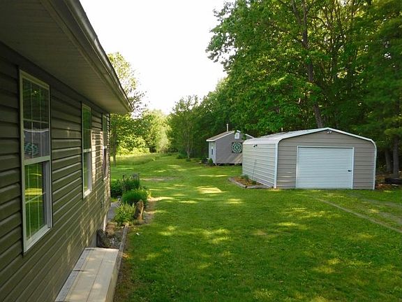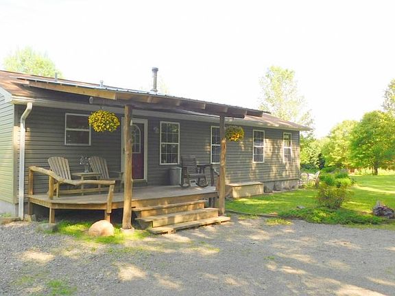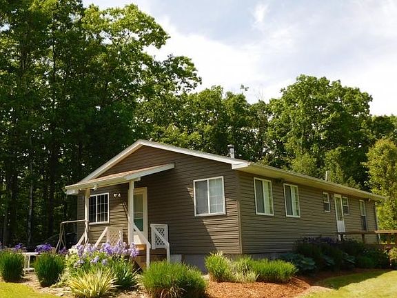 This could be your dream property. Located on 12.8 acres of flat, spacious, lawn and mature woods. Modern house with open floor plan, stainless steel appliances, solid wood cabinets, pantry in laundry room, ceramic tile floors throughout and the home is surrounded by natural light from insulated windows in every room. Heated by propane and pellet stove. Besides the house there are 2 detached 16x16 finished cabins with electric. One cabin has a deck overlooking expansive lawn, mature woods and farmland, w/wood stove for heat. Could be used as guest cottage, artist studio, office, etc. The second cabin, steps away, is a sauna surrounded by trees. There is a green house, plus enough cleared land, for more gardening delight. Also an 18' x 26' garage and wood shed. Located on a quiet, peaceful road w/Stateland across the street. Delightful property to play, hunt, hike and garden. This truly is an oasis all ready for your enjoyment.