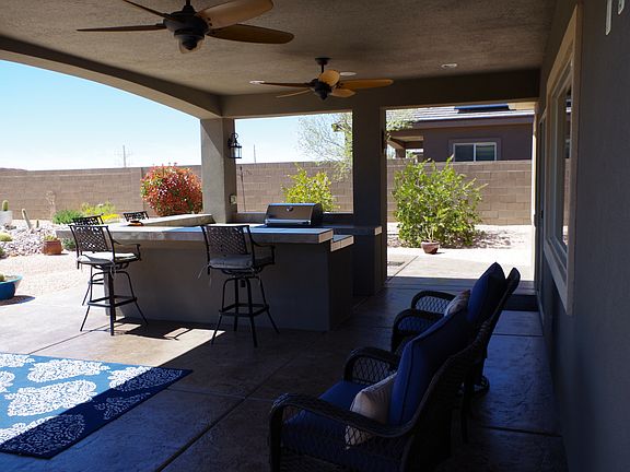 Too many greats to list them all. Must see for yourself. Large 3 car garage with extra storage, outdoor kitchen are, large backyard, view of mountains, fully fenced... and we have not even gone inside yet. Surround Sound in living room and patio, new appliances, freshly painted. New plantation shutters. Seller added cabinets and shelves to closet, and both bathrooms. Lots of storage. Rain gutters. And there's room for a pool. Away from the highway. So many great features.