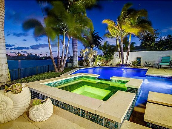 This modern coastal home has it all; incredible water views, lush landscaping, circular paver drive, and distinctly modern upgrades at every turn - everything you've been searching for! This carefully updated mid-century home enjoys the best of both indoor and outdoor space and an ideal western exposure for show stopping sunsets every night! Entering through the stylish glass panel front door-you're greeted by the water views from every inch of the interior. Entertain effortlessly with your choice of two incredible living spaces; the completely open concept interior featuring an unbelievable gourmet kitchen, spacious dining and living room, or your very own waterfront bar and grill complete with lounge and fireplace! Adjacent to the kitchen and dining room, the Florida room enjoys views to the yard and 2nd patio shaded perfectly by towering eureka palms! Following the stepping stones to the under-roof lanai you'll find the outdoor lounge and kitchen complete with bar seating and separate sunny deck surrounding the re-designed pool with sun shelf! The master bedroom enjoys direct patio access to the pool and incredible water views even from the comfort of your bed. Closet space is never an issue with the incredibly organized built in closets with stylish frosted sliding panel doors. The guest rooms have their own bonuses! From enormous closets to the serene and secluded courtyard with swing, this home has it all! Bring the boat and park it right at your very own deepwater 40' slip dock and boat lift!