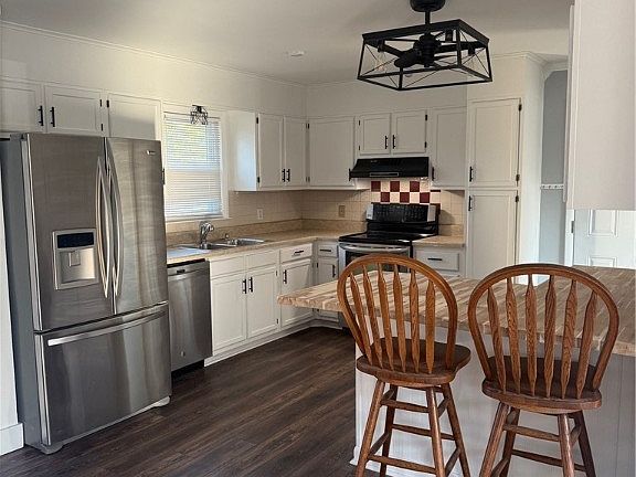 ARRAN LAKES WEST $239,500-Recently updated split level home in the Jack Britt School District with an "Open Floorplan concept" and attached single car garage. This 3 bedroom/2 bath Brick home with vinyl siding has great curb appeal and is located at the end of the Cul-de-sac. Tiled floor entry way plus LVP in the main living areas and hall. The large great room features a wood burning masonry fireplace. A decorative archway leads into the formal dining area. The kitchen is outfitted with white cabinetry and black bar pulls, a tile backsplash, stainless steel appliances (Side by Side Kenmore Refrigerator, Range, Hood-fan, Dishwasher), PLUS a new (2025) Wood Block (Butcher Block) Bar area with cabinets. All three bedrooms have new (2025) carpet. The Main Bedroom has its own bathroom with tiled floor and tub/shower combo. The large backyard has fencing and a huge wired storage building. Many light fixtures in the home were replaced in 2025. Water Heater is 2 years old.