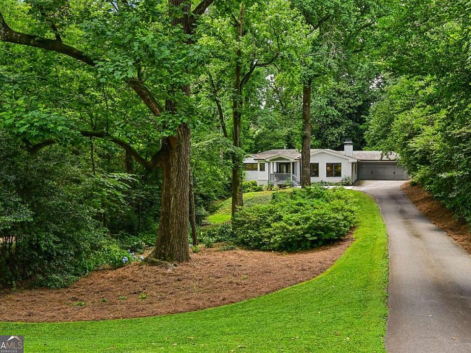Don't miss the opportunity to own a renovated and hard to find ranch home in the community of Hammond Hills. Set back on a private, 0.7 acre lot and surrounded by beautifully mature trees, this property has much to desire. Enter the double doors from the front porch overlooking the landscaped yard into the open and spacious living areas. Tall, beamed ceilings and a stone fireplace surrounded by custom built-ins highlight the family room. Open concept dining and kitchen island are great for entertaining. The kitchen provides white cabinetry, tile backsplash, stone counters, and KitchenAid Appliances. Breakfast/coffee bar and an abundance of counter space. Three bedrooms and two full baths on the main level. Including a powder room suitable for guests. All bedrooms have custom built-in closets. The primary is accompanied by his and hers closets and a primary bath with separate tub and shower and dual vanities. The laundry room and mud area are conveniently located between the kitchen and two car garage. The terrace level offers an additional bedroom or flexible living space and a third full bathroom. The outdoor spaces for entertaining are plentiful. The covered back deck overlooks the fenced-in backyard and offers complete privacy amongst the trees. There are multiple patio spaces for outdoor dining and room for a fire pit. Hammond Hills has no HOA and offers the opportunity to join the neighborhood swim and tennis. Easy access to I-285 and GA-400 and all the shopping and dining options Sandy Springs has to offer.