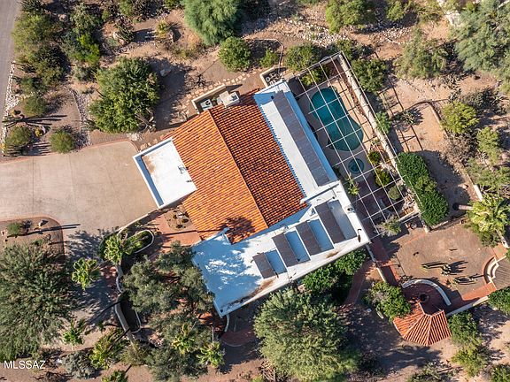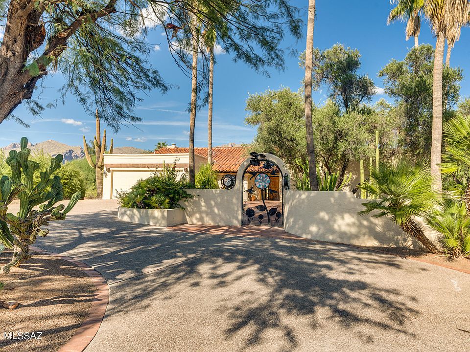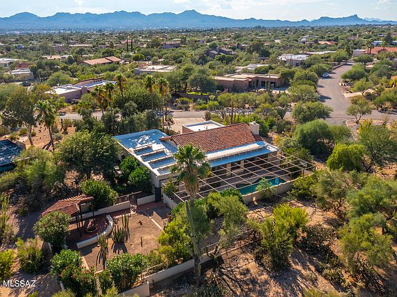 Entertaining Dream Home: This was the model home for the subdivision! Fireplaces, separate wine cellar w/ AC, fire pit, wet bar, outdoor kitchen, lots of natural light, pool, spa & numerous outdoor living spaces set among covered patios, shady trees & established hedges for privacy. Solar is a modern upgrade in this time capsule home w/ new concrete overlay floors (no carpets!) & an abundance of natural wood. New paint inside & out, dual cooling and with 5 bed/3.5 baths you'll have plenty of space! Convenient to La Encantada shopping, Catalina HS and more. This home has personality & character galore and is just waiting for you to bring your own style to make it your perfect home escape.