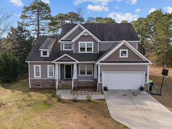 Discover this stunning Fairfield Harbour home, offering a perfect blend of elegance and comfort. Step onto the charming covered front porch and walk into a bright and spacious living area with vaulted ceilings and a striking two-story stone gas fireplace, flanked by built-in cabinets for added storage and style. Double-stacked windows flood the living room with natural light, creating a warm and inviting atmosphere. Custom blinds are installed throughout the home for added privacy and style.