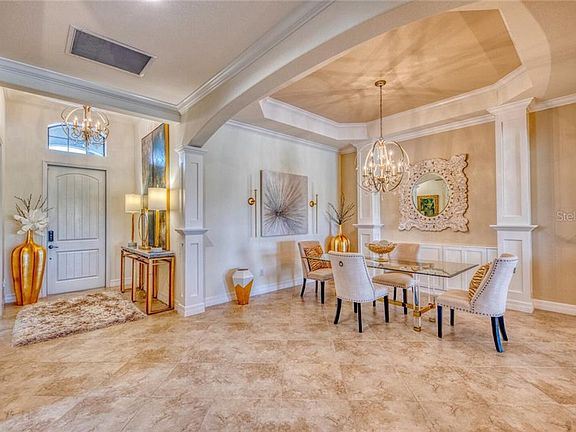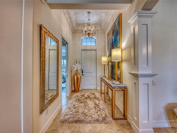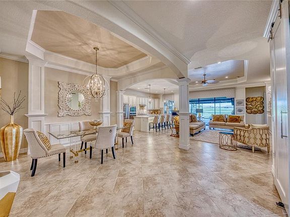 - Interior Features: Ceiling Fans(s), High Ceiling(s), Master Bedroom Downstairs, Open Floorplan, Stone Counters, Walk-In Closet(s), Crown Molding, Solid Wood Cabinets, Kitchen/Family Room Combo, Built in Features, Window Treatments, Tray Ceiling(s), Coffered Ceiling(s), Pest Guard System