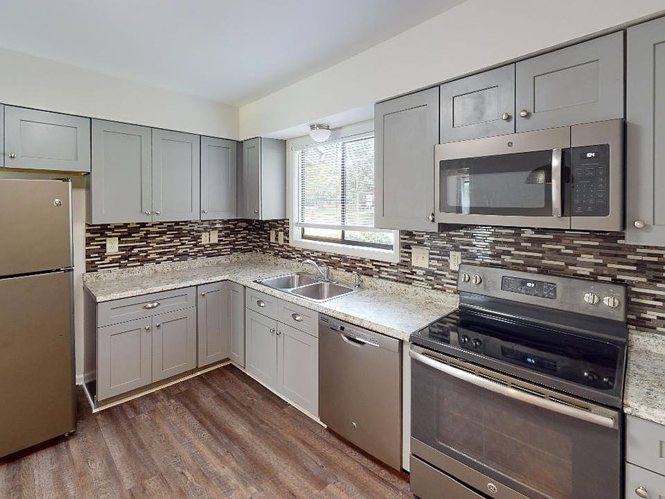Vaulted beamed ceilingsTree lined birnam woodsLarge green spaceVinyl plank floorsSubway tile back splashLarge tree canopyLarge family room