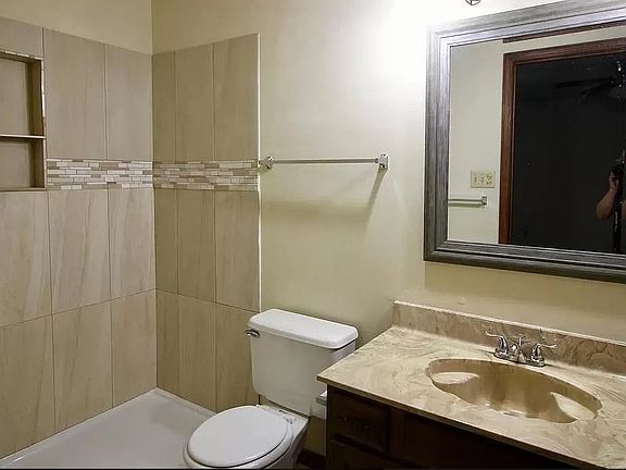 New photos coming 10/22/25 as updates are being completed! This freshly renovated 2-bedroom, 2-bath, 1,200 sq. ft. end-unit townhouse offers comfort, convenience, and modern touches throughout. The home features newly updated bathrooms and vanities, fresh interior paint, and cathedral ceilings that create an open, airy feel. The spacious living room flows into the dining area, accented by large windows that fill the space with natural light. Both bedrooms include attached bathrooms, with the primary suite offering a generous walk-in closet and additional walk-in attic storage. Wood laminate flooring extends through the living area and downstairs bedroom, while the stairs and upstairs suite feature soft carpet for added comfort. The kitchen is equipped with a stove/oven, microwave hood, dishwasher, and side-by-side refrigerator. A laundry room includes washer/dryer hookups, and ceiling fans are installed in the living room and both bedrooms for added efficiency. Enjoy outdoor living with a covered front porch and a shaded, fenced-in back patio area. The property is all-electric, with central A/C and heat, and includes two assigned parking spaces directly in front of the unit. Conveniently located near shopping, restaurants, and major commuter routes this updated townhouse blends space, style, and location.