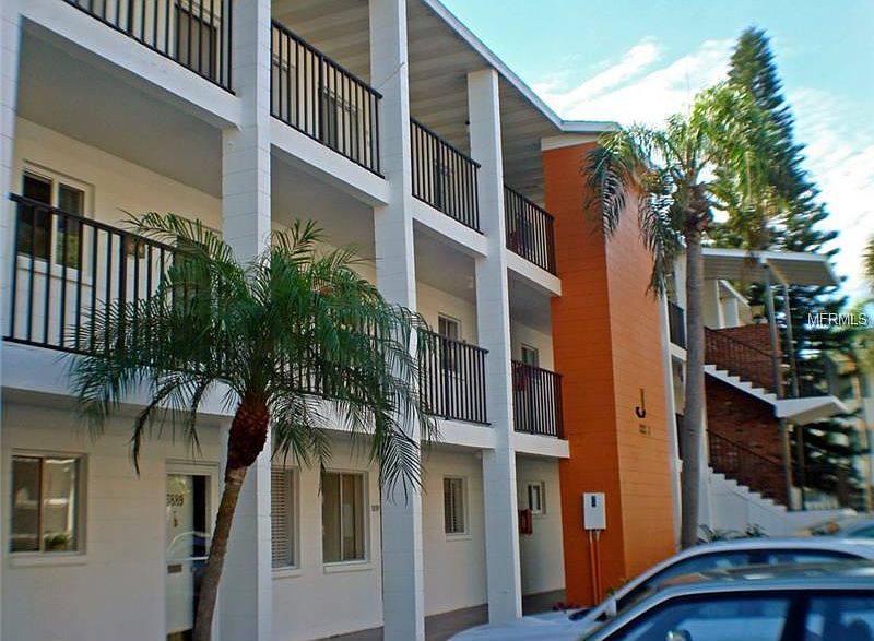 Top floor in desirable 'J-Bldg' with no one overhead. Wonderful (but atypical) interior layout. Extra-long living room instead of a 2nd bedroom, a spacious master bedroom with walk-in closet, PLUS 2 bathrooms. Great floor plan! One of the few in the complex to be built this way. Turnkey furnished. You will enjoy the living area out on the lanai - it's a great location overlooking the park-like grounds. Perfect parking place near elevator. Beautiful heated pool/spa, beautiful grounds, new picnic area, bocce courts, shuffleboard, planned clubhouse activities - all the things you're looking for AND at a bargain price. Only a few blocks to Bayshore Gardens Shopping Center (Publix, Target, TJMaxx, BofA, etc). Public library is nearby. Bus stops close by and plenty of places to eat & enjoy. Come check out this active, busy 55+ community! No pets allowed. Now that snowbirds are leaving it's time to buy rather than wait. Scoop up a great deal now and make this your future winter home...