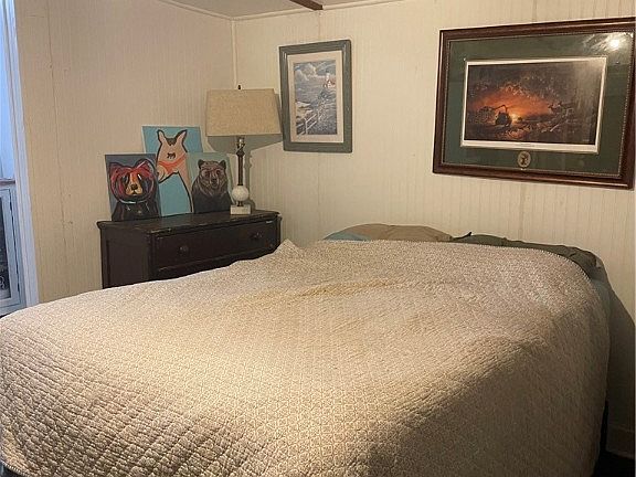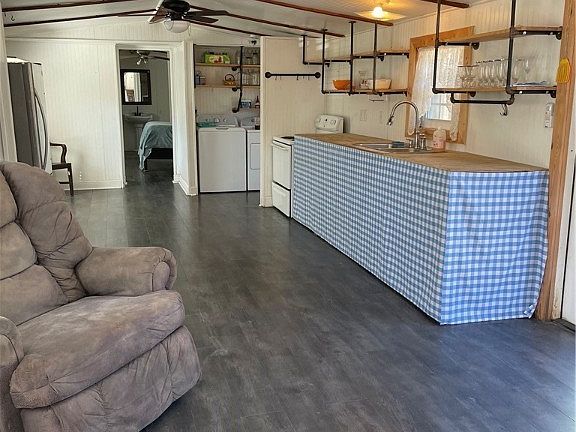 0.98 of an acre. (Trailer is not deeded real property). Brick under pinning. Well insulated walls and ceiling. Large deck 30 x 11. Screened porch. Garage/ work shop 40 x 20 with 110 and 220 volt, lights and electric hoist traverses on I- beam plus 40 x 8 shipping container attached to the shop. The home has plumbing to the 2nd bathroom but no fixtures and is currently being used for a pantry. 2nd bedroom is currently being used for storage. Walk in well pump house. Fenced yard. Refrigerator, washer and dryer to convey with the property.