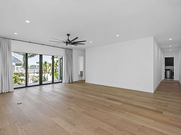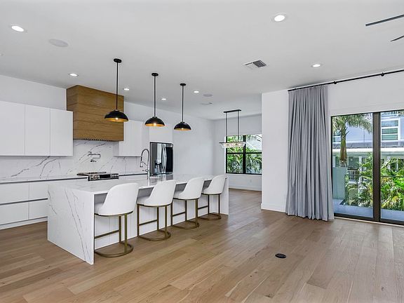 Upstairs, the open-concept layout features 10' ceilings, engineered hardwood floors, and designer finishes throughout. The gourmet kitchen is a chef's dream, outfitted with quartz countertops, an oversized island with breakfast bar, induction cooktop/range, wine fridge, stainless steel appliances, and custom cabinetry with thoughtful pull-outs and abundant storage. The adjacent formal living and dining areas create a seamless flowperfect for entertaining or relaxing with family. Open the sliding glass doors to a covered balcony and enjoy Florida's indoor/outdoor living year-round.