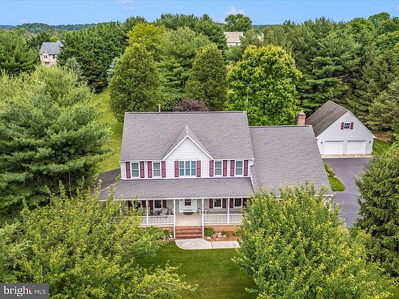 Welcome to 5925 Cabbage Spring Rd! Doves Landing, Mount Airy. This stunning colonial home features 4 bedrooms, 2 full baths, and 1 half bath across 3,500+ finished square feet. Situated on 2 beautiful flat acres, the property includes a 3-car attached garage and a 26’ x 26’ 2-car detached garage with upper-level storage (13’ x 26’) and 100-amp service. Located in the serene suburbs of Carroll County, this home is perfect for entertaining and offers peaceful suburban living. Meticulously maintained and updated, the home welcomes you with a long picturesque driveway leading to a 50’ x 20’ wrap-around front porch. The main level features a spacious foyer, private office with built-in shelving, formal living and dining rooms, a timeless kitchen with 42-inch cherry cabinets, downdraft cooktop, smart wall oven, smart dishwasher, built-in microwave, and granite countertops and island. Additionally, there is a breakfast area, cozy family room with a gas fireplace, and an oversized laundry/mudroom off the three-car garage. Upstairs, the primary bedroom boasts a walk-in closet and en-suite bathroom. Three additional well-sized bedrooms with deep closets share a well-appointed hall bath with dual vanity and tub shower. The partially finished basement offers LVP flooring, recreational space large enough for a pool table, exercise equipment, arcade games, and ample storage space in the utility room. Enjoy summer BBQs and gatherings in the level backyard. Updates include: Water Conditioning System (2024), Reverse Osmosis System (2024), Driveway Resealed (2023), Dual Zone A/C Outdoor Compressors (2021), Second Level Windows (2021), Main Level Front Windows (2021), Sliding Glass Door (2021), Electric Water Heater (2021), Pressure Tank (2020), 50-Year Architectural Roof (2016), New Kitchen Appliances, 400-amp Main House Electric Service, septic recently pumped, and much more! Conveniently close to major commuter routes, Challedon golf course, schools, shopping, parks, and recreation, this home is truly one of a kind and won't last long. Schedule your showing before it's too late!