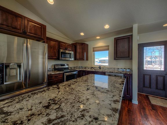 Here's an executive home with wonderful views. The home features an open floor plan with three bedrooms on the main level including a fantastic master bedroom with walk-in closet, double vanity, shower, and jetted tub in the master bath, with access to the back deck complete with glorious westward view. In addition to the master bath, there's an additional spare bedroom bath, plus another half bath. The kitchen features upgraded cabinetry with self closing drawers, a pantry, stainless appliances, granite counter-tops, island breakfast bar and all open to the dining area and living room with its cozy gas fireplace as the focal point. Downstairs there's an expansive open family room with walk-out and wet bar, two additional bedrooms, full bath, utility room with tons of storage, and additional bonus storage room at the bottom of the steps. Make this one your home today! Tenant pays all utilities
