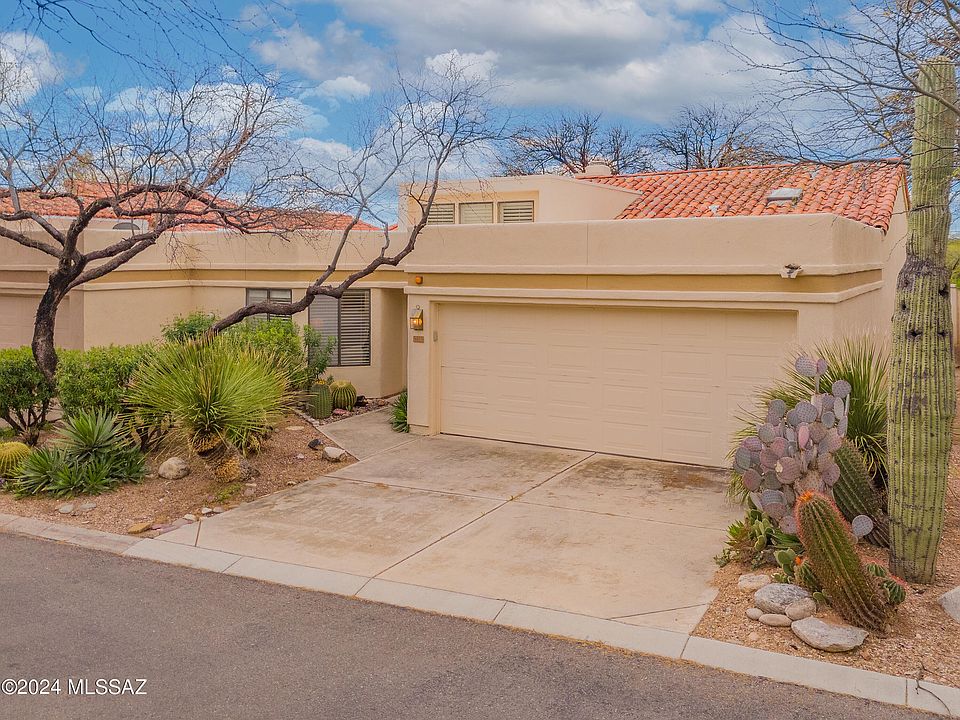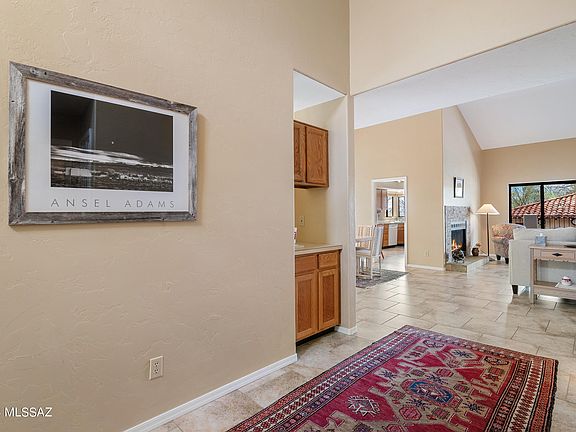 Welcome to the esteemed Las Palomitas community! This spacious townhouse offers a split three bedroom floor plan all on one level. The open living and dining areas boast incredibly high cathedral ceilings, a wood burning fire place, and are cascaded in natural light. Step outside onto one of the two covered patios and soak up the sun while surrounded by the exquisite desert landscape. Enjoy the sparkling community pool + spa located just steps away from the back patio. This townhouse comes equipped with a two car garage, water softener, 2yr old HVAC system, and guest parking just around the corner! Centrally located, this property is minutes away from shopping, dining, golfing and all other offerings at La Encantada. This home is being sold with or without most furnishings!