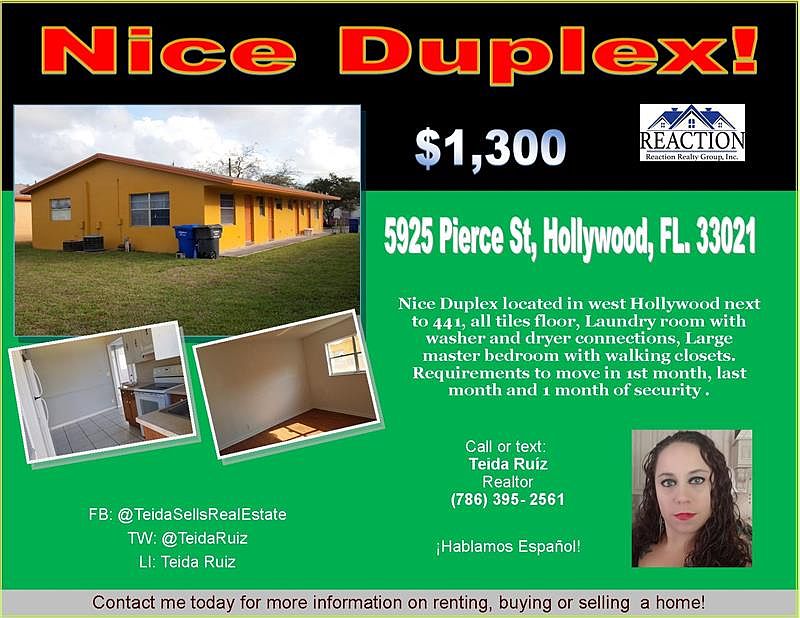 Nice Duplex located in west Hollywood next to 441, all tiles floor, Laundry room with washer and dryer connections, Large master bedroom with walking closets. Requirements to move in 1st month, last month and 1 month of security . Call or text: Teida Ruiz Realtor Reaction Realty Group (786) 395- 2561 Contact me today for more information on renting, buying or selling a home! Hablamos Espaol!