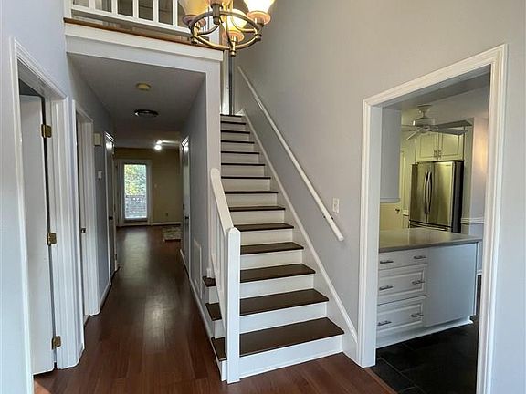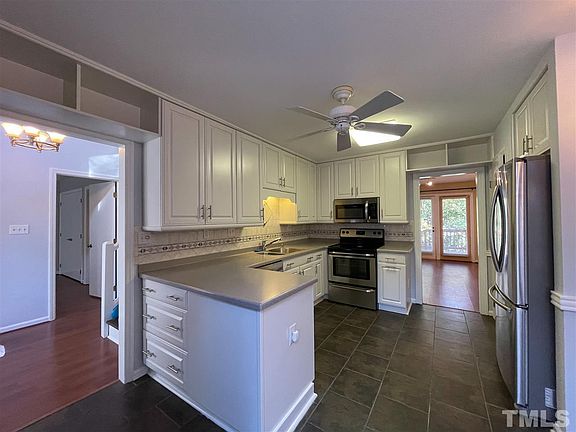 Highly sought after 27609 location with three full baths, downstairs bedroom with full bath, new granite in all bathrooms, fresh paint, beautiful white kitchen, SS appliances, new microwave, washer dryer and refrigerator convey. Laminate wood flooring throughout main living, storage galore! LR w/ built in shelves, bar with sink, china cabinet in DR. New ceiling fans upstairs, new faucets in bathrooms. Enormous private deck, walk in crawlspace for extra workshop/storage.