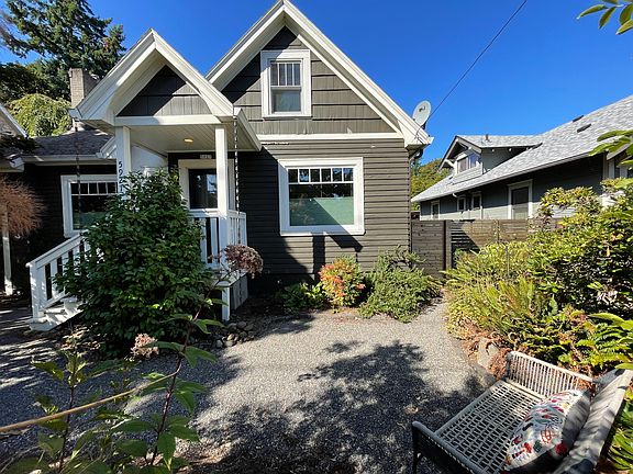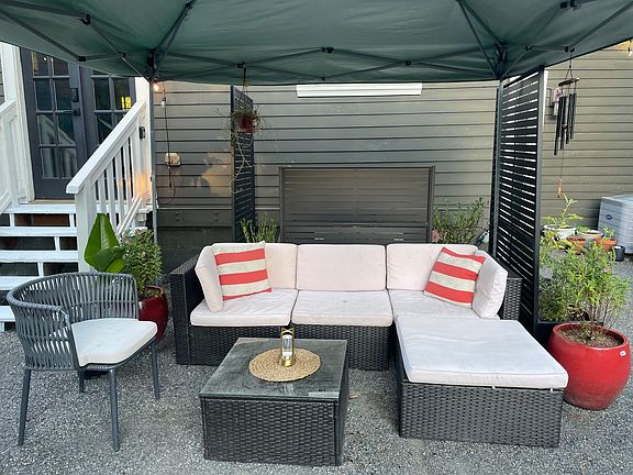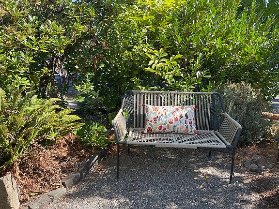 The backyard is a garden oasis. Catch fabulous sunsets from your private, covered, western-facing sitting area surrounded by plants. An intimately lit dining and grilling area is decorated by a harvestable grape arbor (still some on the vine!). Relax near the fire pit in the back corner of the yard, framed by fruit trees and raised garden beds.
