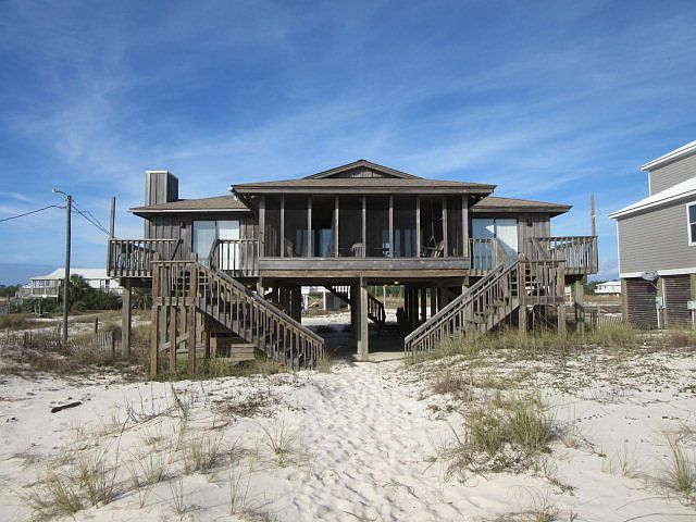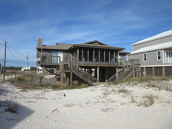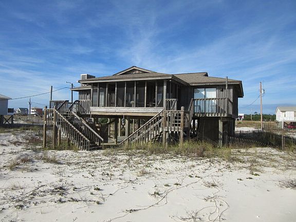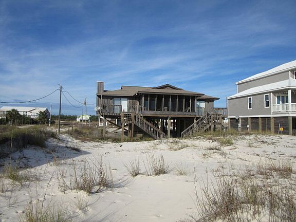 AFFORDABLE GULF FRONT! Beautiful views of Sugar White Beaches from this very comfortable Living/Dining/Kitchen area which opens to huge deck screened & open. Screened porch has swing & table. Three bedrooms/ 2.5 baths. Gulf Front Master & guest bedroom open to decks. Master has extra vanity. Rental Program. Sink & Fish cleaning station. Outside shower. Near World Class Golf, Marina, Charter Fishing, Restaurants, Ferry & Historic Fort Morgan. Must see this one! Come enjoy our beautiful area.