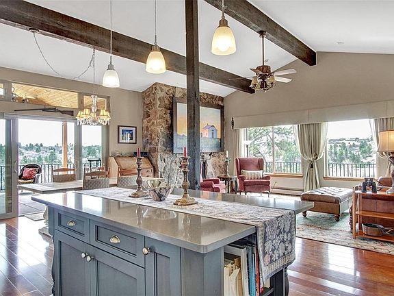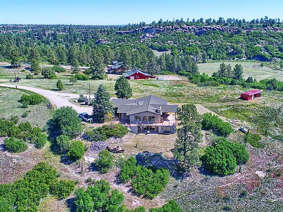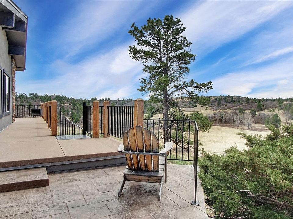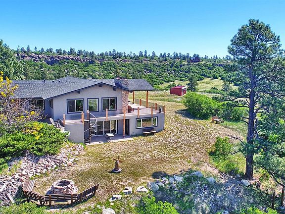 Unique & exquisite property - 80 lush acres located on coveted Willow Creek with panoramic box canyon, pond, meadow & mountain views. Country quiet yet City close, 6 miles to Downtown Castle Rock, 25 minutes to DTC. Expanded & renovated to perfection; outstanding views beckon at every turn. Great room & chef's kitchen blend seamlessly for relaxed entertaining. Extraordinary craftsmanship in the Brazilian hardwoods & custom millwork throughout. Master Suite with luxurious bath. Walk-out lower level invites casual yet elegant entertaining. Rare opportunity to create your own legacy property with Zip Line for the kids, Livestock shelter with storage, tack room, electricity & water for your equestrian needs. Hiking, riding, XC skiing or your own farm to table gardens it's all possible here. Water rights, domestic well. The northwestern-most 12.62 acres is designated as a building site with the remaining in Conservation Easement to preserve this significant land in perpetuity.