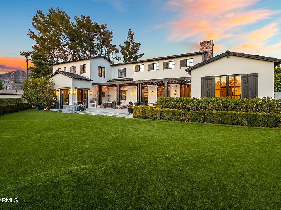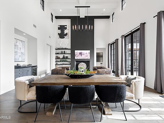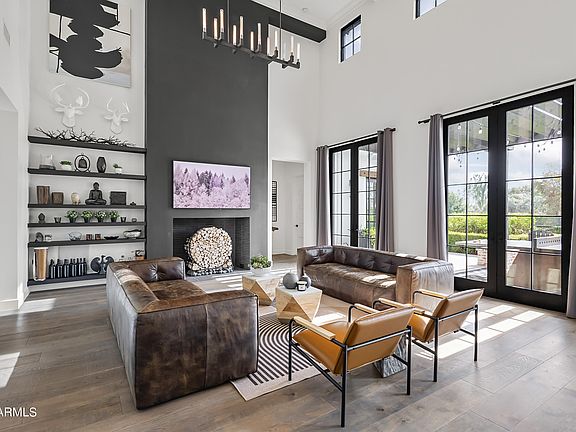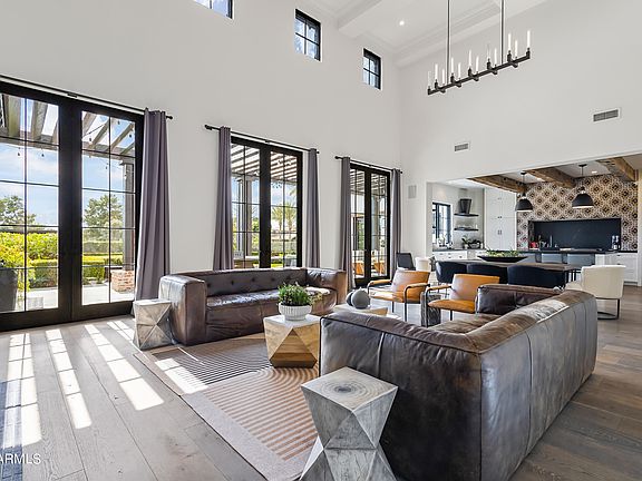 Modern farmhouse estate on the 15th hole of Arizona Country Club, featured in Phoenix Home & Garden. Gated with a golf cart entrance, this over half-acre lot offers stunning Camelback and Papago Mountain views, plus an estate-style driveway with custom pavers and parking for 10+ vehicles. Inside: French oak flooring, reclaimed wood beams, and soaring 25' ceilings. The open-concept layout includes a great room with a statement fireplace and art wall, chef's kitchen with high-end appliances and double ovens, and French doors that invite natural light throughout. The primary suite features private spa access, dual vanities, a freestanding tub, oversized shower, and custom closets. Designed for indoor/outdoor living with a heated pool, two spas, two pergolas, built-in BBQ, outdoor kegerator, TVs, and more. Smart home tech, EV charger, multiple suites, and a hidden 6th bedroom/office. Quiet, private, and just minutes to Old Town Scottsdale.