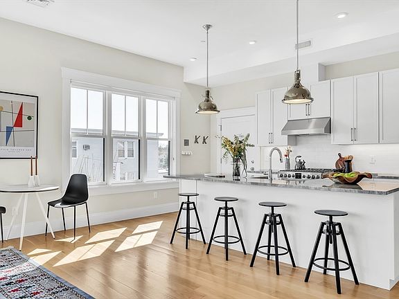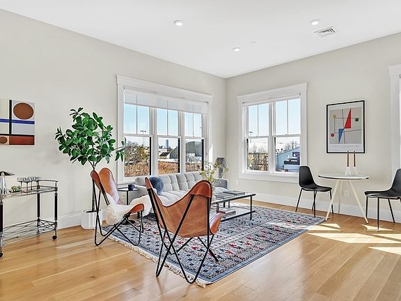 Porter Union Condominiums - 2015 construction between Porter & Union Squares. Unit 4 is arguably best positioned being on the third floor w/ SE exposure & views of Boston. Sun-filled living space w/ 10' ceilings & white oak floors. Handsome kitchen w/ marble counters, upgraded cabinets, professional SS apps & expansive center island w/ bar top. Study w/ double doors opening to the main living area. East facing en-suite primary bedroom features french doors to a private balcony, as well as a 6' x 10' walk-in closet. The marble primary bath has a double vanity & spacious shower w/ glass enclosure. Second bedroom has SE exposure & custom closets. The second bath has subway tile shower/tub & marble vanity. Additional highlights of this home include in-unit laundry, central air, Navien tankless hot water & LED lighting. Enjoy easy access to the Red Line in Porter Square & Green Line in Union Square w/ shop, services, & restaurants. Enjoy a covered parking spot & storage. A great city home!