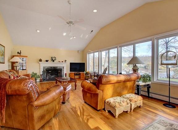 Over 100' direct lake frontage w/dock, beach, gorgeous views. Renovated, expanded cape. FR w/wall of windows & spectacular views & access to deck & expansive lawn. Kit w/huge DA. 2 1st flr BRs & full updated bath. 2nd flr has MBR w/vaulted ceiling. Fin LL