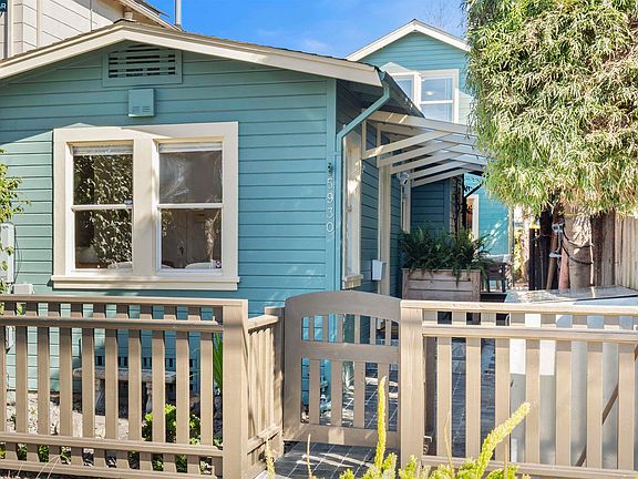 Nestled on a quiet tree-lined street sits this charming two bedroom, two bath + office space home where you can experience true California indoor / outdoor living. Imagine a traditional 1920s San Francisco row house mixed with coastal design & add custom reclaimed wood throughout with modern amenities to create the ideal Oakland home. This meticulous home was once owned by a woodworker who used his craft to create custom touches from the front door to reclaimed teak kitchen cabinets to Brazilian hardwood floors showcasing the luxury materials used throughout while maintaining the original charm. Recently renovated bathrooms, kitchen & backyard. Light gushes through the many windows & the multiple French doors that open to the sunny outdoor spaces ideal for entertaining, playing or relaxing. Artistic tile, quartz countertops, high ceilings, new light fixtures & custom window coverings create a luxury experience in each & every room. Each inch of the property is fully utilized including the ample storage options throughout. Views of the Berkley Hills from the primary bedroom & located just around the corner from parks, cafes & restaurants including a short commute to downtown San Francisco, 5930 Vallejo Street has it all.