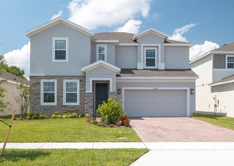Don't miss out on our special pre-Grand opening pricing! Our exceptional Move-In ready Newcastle plan features 4 Bedrooms, 2.5 Baths, and 2 car Garage with separate front Living Room/Flex Space that can also be used for an office or playroom. Open concept design with great space for entertaining, and a Dining area overlooking rear covered Lanai - perfect for outdoor living. Beautiful Kitchen features 42" upper cabinets with crown molding, quartz countertops, large walk-in pantry, and Stainless appliances. Tile flooring in Main Living areas on 1st floor, and window blinds included throughout. Primary Bedroom includes en-suite with walk-in closet, double sinks set in adult-height vanity, and walk-in shower with wall tile surround, Our High Performance Homes offer energy efficiency and home automation technology. Exterior includes Stone accent and brick paver driveway and lead walk. Trinity Place amenities include resort-style pool and cabana, a shaded tot lot for the little ones, and a dog park. Community is conveniently located near Shopping and Dining, with easy access to major thoroughfares and just a short drive to Disney.