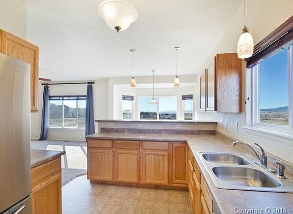 You must stand on the back deck and take in these views in person, amazing! Open concept home with unobstructed views of the mountains including Pikes Peak. Your like new home backs to open space with gate connecting you to the trail system. The yard work has been done, the window coverings are already up, nothing for you to do but move in and enjoy this 4 bed 3 bath home with a tandem 3 car garage. Upgraded stainless steel appliances, including LG washer and dryer, Samsung dishwasher, three car garage, A/C, water filtration system