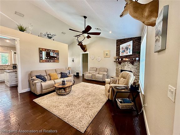 Custom-built in 2019 by the builder for the builder, this exceptional home sits on 2 fully fenced acres in desirable Orange Blossom Estates. Offering over 2,150 SF under air, the home features 3 spacious bedrooms, an additional office/craft room, 2 baths, and an oversized attached garage. Highlights include cathedral ceilings with crown molding, a stunning wood-burning brick fireplace, and a state-of-the-art kitchen with gas cooktop, pot filler, large island, and oversized pantry. Outside is built for lifestyle and storage with an inground fiberglass saltwater pool with brick pavers, firepit, irrigated lawn, and two massive pole barns (14’ clearance) with 50-amp hookups—perfect for RVs, boats, and toys—plus an enclosed A/C office. Hardy board exterior adds modern appeal. Prime location close to shopping, schools, medical, and more. A rare property that truly checks every box.