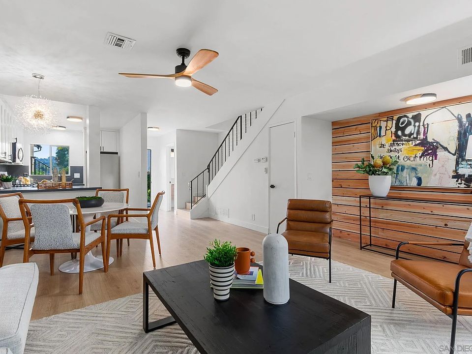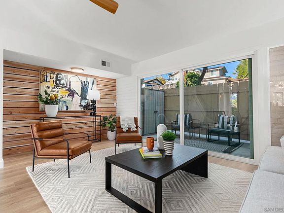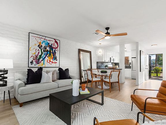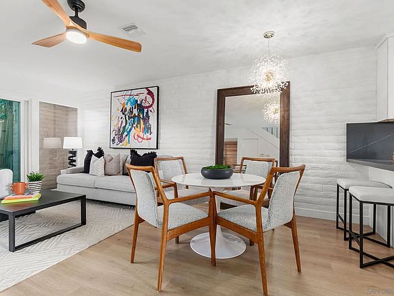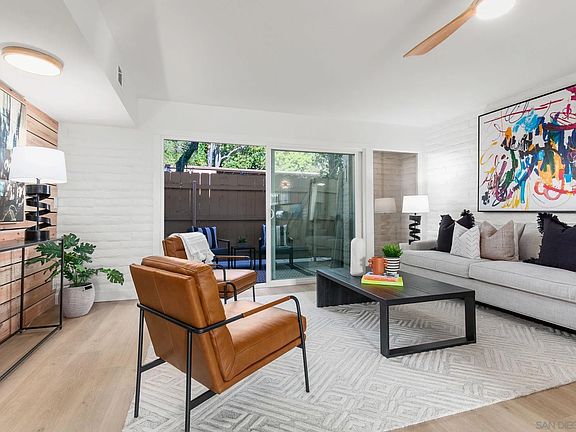 A stunning mid-century modern townhome w/ a high-quality renovation by Novo Redo, one of the top construction & interior design companies in SD. Brand-new cabinets & stainless-steel appliances, gorgeous quartz countertops & backsplash w/ kitchen bar, brand-new commercial water-resistant laminate flooring, new custom interior paint, resort style living in this brand-new bathroom w/ rain shower, brand-new light fixtures & fans, exposed wood beamed vaulted ceilings & rustic chic brick walls throughout, natural wood accent wall (with electrical) in this spacious living room w/ huge slider & windows to the patio, generously sized bedrooms w/ two closets in each. This townhome feels like a house w/ in-unit laundry, no one above or below you & gate access through the patio. Private storage, one covered parking spot & options for 2 spots. Grossmont Village is a park-like complex w/ manicured grounds, mature trees, 3 pools & 2 clubhouses nestled in the foothills of La Mesa. Close to everything; minutes to the freeway, Grossmont mall, Sharp hospital, schools & a ten-minute walk to the trolley station. FHA & VA approved! Don't miss your opportunity at this highly sought after complex!