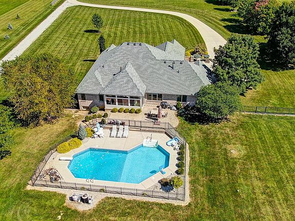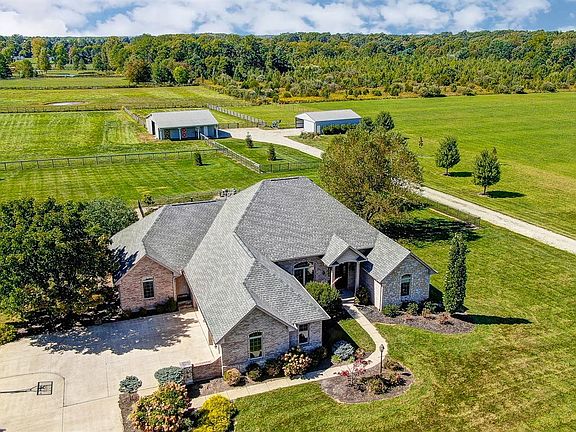 Custom Built, all brick and stone ranch, 8.22 acres, FOUR bedrooms above grade, 2762 sf (per auditor)-PLUS- 2762 sf of basement area, soaring ceilings, custom moldings, granite counters, gated entry, beautiful heated and BIG in-ground pool. Solar panels + geothermal system= extremely low utility bill. Two large barns, 4 stalls, multiple fenced pastures & paddock. This house pretty much has it all, come make it your private country estate.