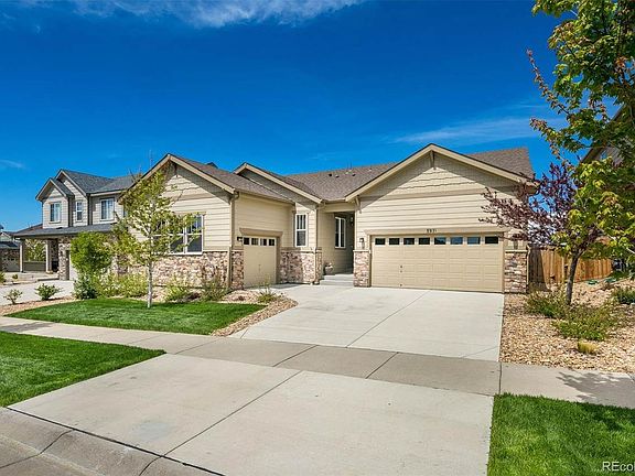 Gorgeous 5-year old Wheatlands home with spacious ranch floorplan, 4 bedrooms, and a 3-car garage. If you are looking for easy main-level living, this is the home for you! You'll find 3 bedrooms, 2 full bathrooms, a study, and the laundry room all on the main level. In the basement there is an additional conforming bedroom with walk-in closet, a huge multifunctional great room, a large bonus room that could be used as a 2nd office, media room, workout room, or guest room, plus a very large unfinished storage area that is large enough to finish out for even more space if needed. The beautifully modern kitchen includes white cabinetry, granite counters, stainless steel appliances with a double oven, extended counter space, plus a large counter-height central island with additional seating. The natural light, lovely wood floors, modern finishes, and open feel of this home will be sure to delight you! The backyard is an outdoor paradise with your very own fully landscaped, low maintenance garden oasis. You'll love being so close to the Southlands shopping center, the Aurora Reservoir with swimming beach, the new YMCA, open space, community parks, trails, and you're even walking distance to the local schools. And don't forget the Wheatlands clubhouse and pool for all of your summer fun! This house won't last - make sure to stop by the open houses this weekend Sat/Sun 12-3.
