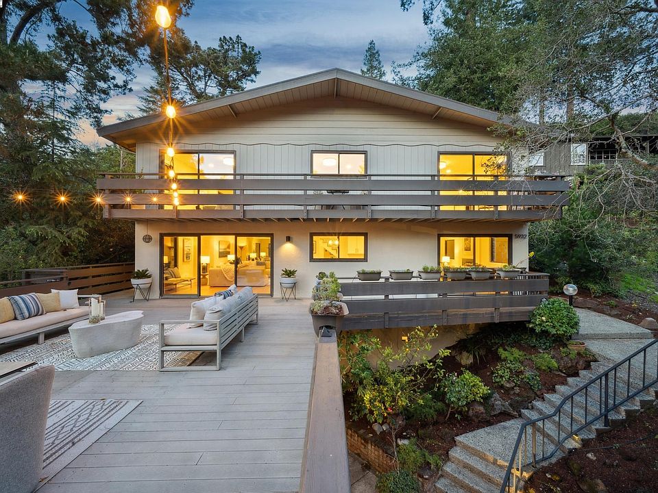 Enjoy exquisite Mid-century architecture, an exceptional California lifestyle, open rooms and blissful seclusion in this thoughtfully modernized 4BD/2.5BA home on the coveted Piedmont side of Montclair. Featuring 2924 SQFT on approximately 1/4 acre, this welcoming home breathes casual elegance. The open main level features a formal entry, great room, and dining and living areas anchored by a marble fireplace, floor-to-ceiling windows, a deep storage room (or future bar for entertaining?) and glass doors opening to the massive deck. Surrounded by oak trees, you can dine al fresco, entertain friends, or simply relax in this serene and private setting. The modern kitchen opens onto an additional dining area and family room with a second fireplace. Upstairs, you will find 4 bedrooms on one level. The primary suite boasts a giant custom dressing area, ensuite bath, and glass doors to a large balcony shared with a second bedroom, also with an ensuite bath. Two more bedrooms and a laundry room complete the floor. The lovely backyard features a play structure, raised beds, patios, and open space. This home also has a two-car carport with internal access, storage, and an EV hook-up, just moments to downtown Piedmont, Rockridge, Montclair Village, sought-after schools, and regional parks!