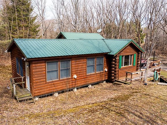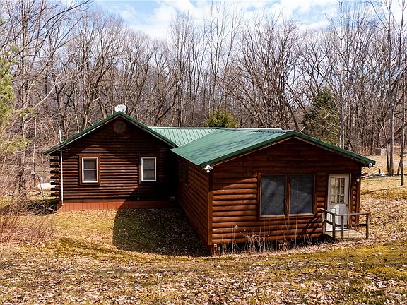 Secluded peace of paradise to live/camp and or hunt! The property is ready move in condition. The main house is a Hi-end log kit and the 2 bedroom addition is frame construction and log siding. Beautiful 1/2 acre pond. There is also a stream crossing the front of the property. This is a year round home with well, septic, forced air heat. Mostly wooded acreage .There is approx. 5 acre meadow on the topside of the parcel.