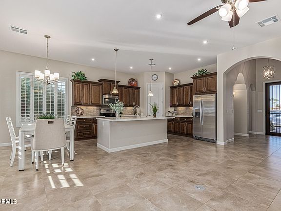 *You will love this one* Bring offer! Gorgeous, well maintained home in 55+ active community of Apache Wells w/golf & many social activities. Beautiful finishes t/o. Open concept kitchen, staggered cabinets w/crown molding, quartz counters, tile backsplash, large island w/breakfast bar, pendant lighting, walk-in pantry, S/S appliances. Lavish master bath w/double sinks, amazing shower w/bench & spacious walk-in closet. Huge laundry room w/ storage closet, sink & numerous cabinets & room to add a desk. Also 9 &10 ft ceilings, 20x20 tile, 4''+ baseboards, fans, plantation shutters, tankless H2O, pavered drive, ext covered patio, 2x6 construction, 2 car garage. Apache Wells is in transition between the older manufactured home & new custom homes. Get in on the early side & reap the benefits! Alcove in large entry offers extra space for desk, bar or curio cabinet. Exterior of home includes stone accents, paver driveway & extended covered paver patio. Home features 2x6 construction, tankless H20 heater, soft water loop, low maintenance.