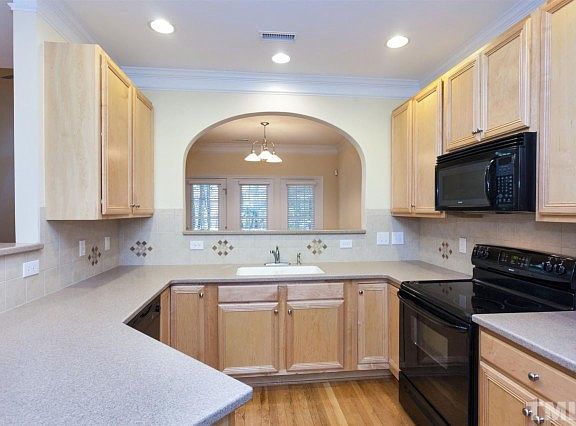 Pristine Town Home in Prime North Raleigh Location with Tree-Lined Streets. Functional layout with attached garage, covered porches and private wooded view. Hardwoods throughout Main, solid surface counters, maple cabinets; two story family with vented fireplace; spacious master suite with whirlpool tub and tray ceiling, generously sized secondary bedrooms. Extra storage spaces, community pool, exterior maintenance included, walking distance to Triangle Town Center.