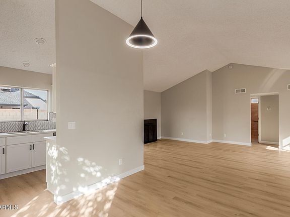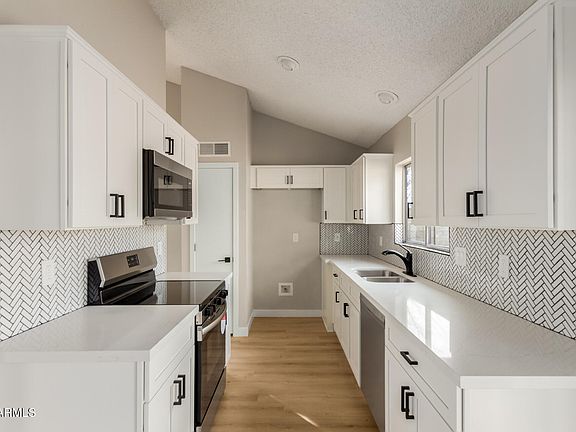A charming, remodeled 2-bed, 1-bath residence is now for sale! Featuring an awesome open floor plan with vaulted ceilings, elegant wood-look luxury vinyl flooring, and a neutral palette throughout. The galley kitchen has everything you need: ample new shaker cabinets with quartz counters, a pantry, herringbone tile backsplash, and stainless steel appliances. The primary bedroom boasts brand-new soft carpet and direct bath access with a sliding barn door. ALL NEW PAINT INSIDE & OUT, NEW SHAKER CABINETS, HARDWARE, BASEBOARDS, WATER HEATER & STAINLESS APPLIANCES! Lastly, the cozy backyard with its covered patio is a blank canvas ready to become your private oasis! What are you waiting for? Come see it!