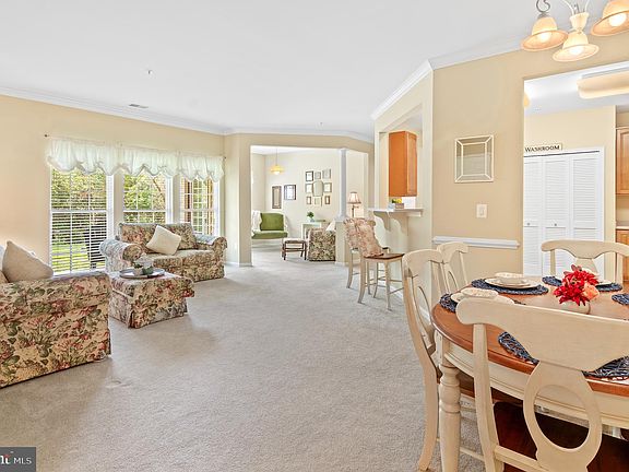 Welcome home! Gorgeous 2 Bedroom, 2 Bath Ground Floor Condo in 55+ community in Elkridge. Enter this sun filled home to find open concept living and dining area with a beautiful tree view out of the floor to ceiling windows! The inviting kitchen features Corian counters with integrated sink, pantry, laundry and a pass through to the living room allowing lots of natural light in. Walk through the den/office and step outside to have your morning coffee on your private patio with views of the common grassy area and the trees behind it. There are 2 Bedrooms on opposite ends of the condo. The primary bedroom has a ceiling fan and two closets, one is a walk-in plus an ensuite bath with dual vanities, linen closet and a shower. The Second Bedroom has a closet and attached full bath with a linen closet and tub/shower, also accessible from the main living area. This condo is located in a secure building with intercoms. Enter the home through the main building or from the patio that opens to a large grassy area, perfect if you own a pet! One parking spot for each condo plus plenty of visitor parking. Giant Food & Retail Stores are a short distance away! Very easy access to Rt 100 & I95. This is an estate sale.