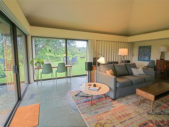 Don't miss the opportunity to own this stunning mid-century style home designed by renowned Vermont architect Marcel Beaudin, set on 4.35 acres with breathtaking pastoral views and mountain sunrises in Shelburne. This property offers effortless one-level living with a sunny floor plan, featuring floor-to-ceiling windows and sliding glass doors that blur the line between indoor and outdoor spaces, perfect for seamless entertaining. The kitchen features stainless steel appliances and a picturesque view of the backyard and mountains, while the adjacent dining room provides ample space for everyone to gather for meals. The home offers slate floors, minimalist cabinetry, and a gas fireplace wall in the spacious living room. The private primary suite includes two separate closets plus an en suite bath, while additional built-in storage throughout the home and a 2-car garage ensure plenty of space for your belongings. Custom blinds adorn the windows and glass doors, while mini-splits keep the home comfortable year-round. The private, beautifully landscaped homesite is graced with rock walls, natural rocks, and mature trees. Just minutes from Shelburne Village and South Burlington, you'll have easy access to a variety of amenities including restaurants, shops, schools, and more.