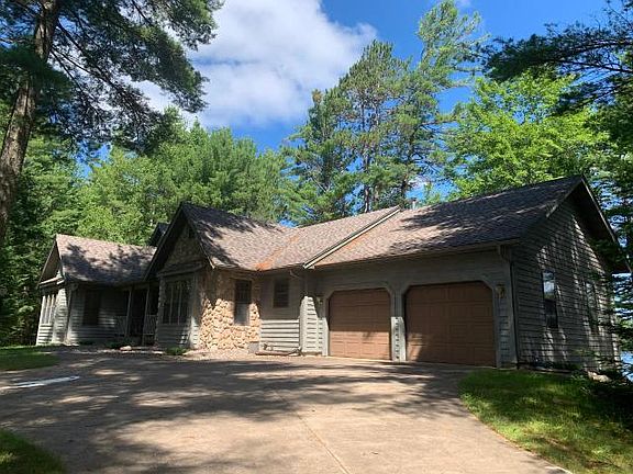 Private paradise! Snuggled in the piney woods on THREE lots with over 500' sandy frontage on serene East Twin Lake. Custom-built residence enjoys a popular floor plan, w large master suite (whirlpool tub; walk-in closet) on it's own at lakeside, plus airy living room featuring wood burning stone fireplace, two south-facing dormers and adjacent 4 season knotty pine porch! Fresh carpet! Chef's kitchen w several new appliances, counters, w both formal dining and breakfast nook. Lower level has excellent recreation room w a second gas-log fireplace and built-in bookcases and media cabinetry. Walk out to lake! Central room, nearing completion, would make a fabulous home theater, exercise room, large office? There's another generous bedroom on this level w big closet and bath. Plenty of storage throughout, including attached 2 car garage and BONUS XL detached garage. Located "on the quiet side" w 562 shared acres to hike, snowmobile, ATV, ski...and access lot on Bear Lake for big water fun!