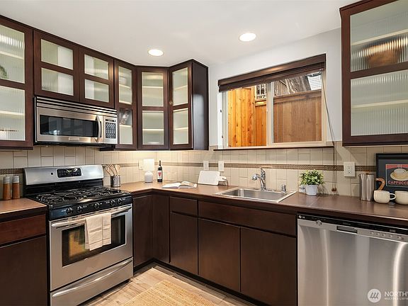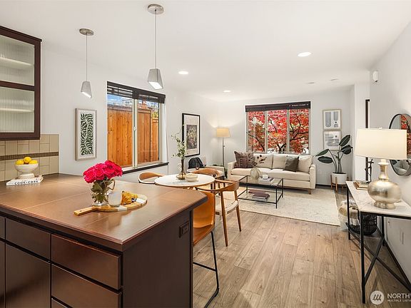 Sleek modern design meets functionality in this thoughtful two-story townhome. A reeded glass entry door opens to light-filled interiors, where a pretty tree frames the window for added privacy. The gourmet kitchen features a natural stone serving bar, high-end appliances & reeded glass cupboards with abundant storage. The open living room is perfect for both relaxation & entertaining. Upstairs, two bedrooms share a full bath & laundry for added convenience. Enjoy excellent privacy, a well-designed layout, off street parking & a private courtyard entry. Recent updates include new flooring, lighting & fencing. Just minutes from the West Seattle Junction, this Fauntleroy home blends scenic tranquility with urban convenience.No HOA fees.