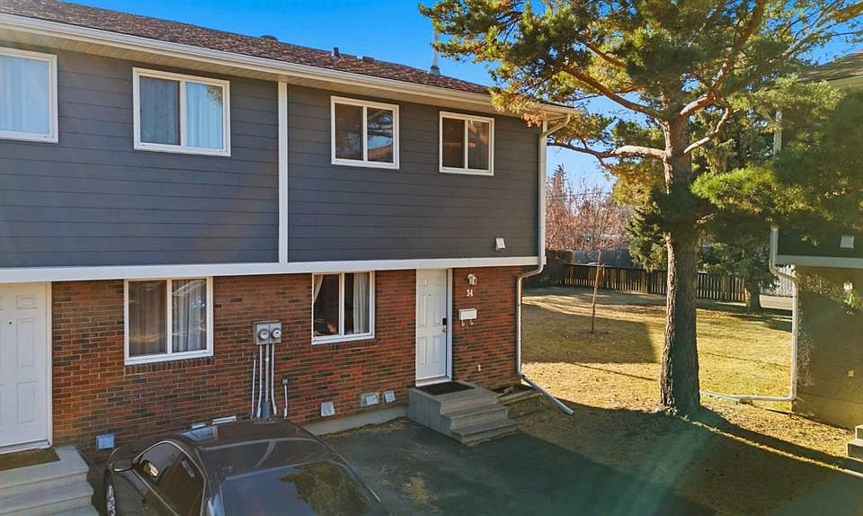 Welcome to #34, 5935 63 Street, a charming 2-storey half duplex in Hilltop Estates. This home offers 3 bedrooms, 3 bathrooms, and a thoughtful layout designed for comfort and convenience. Step inside to a bright and welcoming main floor featuring a cozy dining area and a half bathroom just off the front entry. The efficient galley-style kitchen provides plenty of counter space and a practical walkthrough design, seamlessly connecting to the spacious living room. A large sliding patio door floods the space with natural light and opens to a private fenced backyard—perfect for relaxing or entertaining. Durable laminate and vinyl plank flooring run throughout the main level, offering both style and easy maintenance. Upstairs, you’ll find a generous primary bedroom with a large closet and direct access to a 4-piece bathroom through a convenient cheater door. Two additional bedrooms complete the upper level, providing plenty of space for family, guests, or a home office. The partially finished basement adds even more living space, featuring a large family room, a 3-piece bathroom, roughed in, laundry area, and ample storage. Outside, enjoy your own parking stall right at your door, plus a fenced yard beside green space for added privacy. Located close to schools, playgrounds, the Dawe Rec Centre, shopping, restaurants, and public transit, this home combines value, location, and comfort. Pets are allowed (with restrictions), making it an excellent choice for first-time buyers, families, or investors alike.